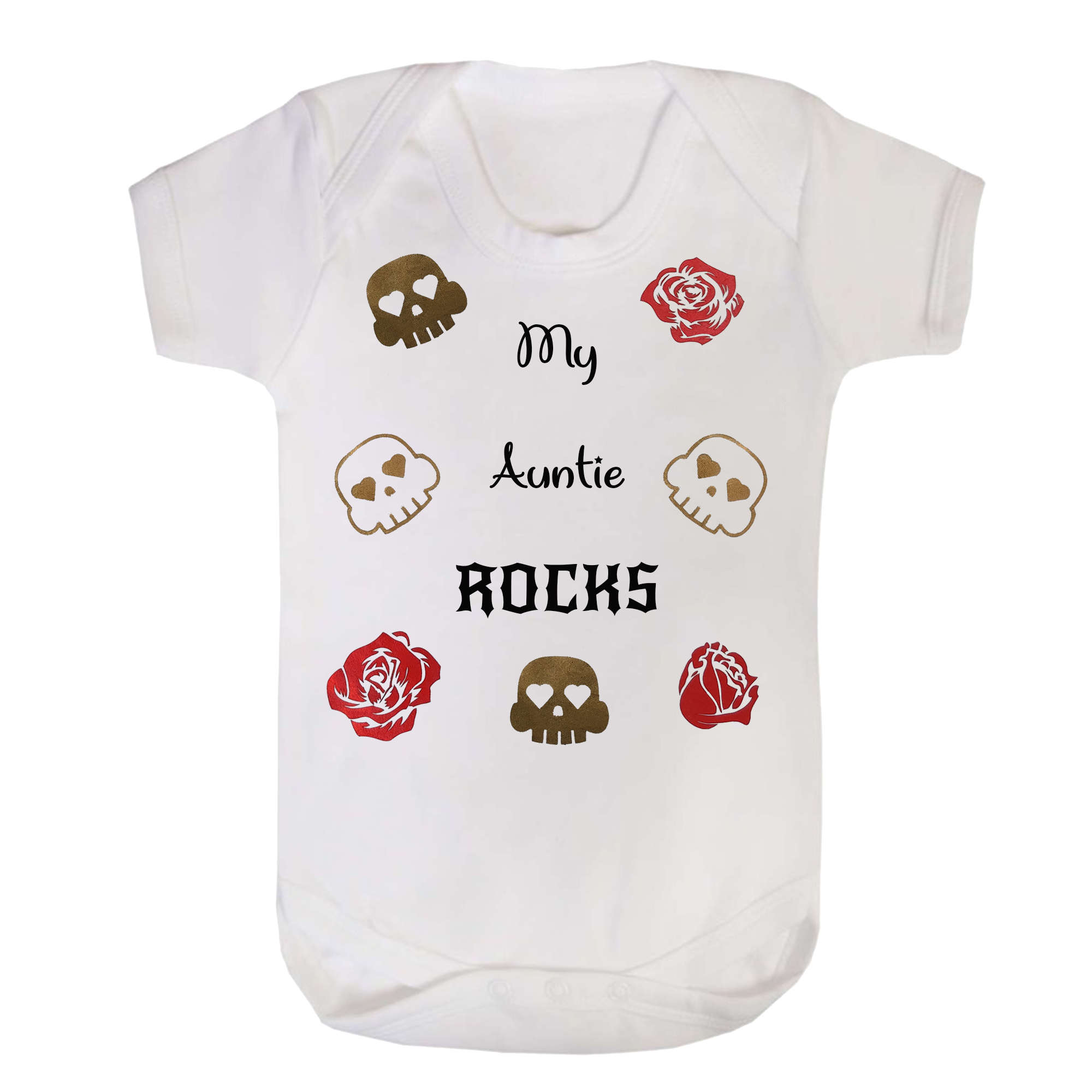 Little rockstars my auntie rocks baby grow with red metallic roses perfect for birthdays or as a gift or a present for your little rockstars.