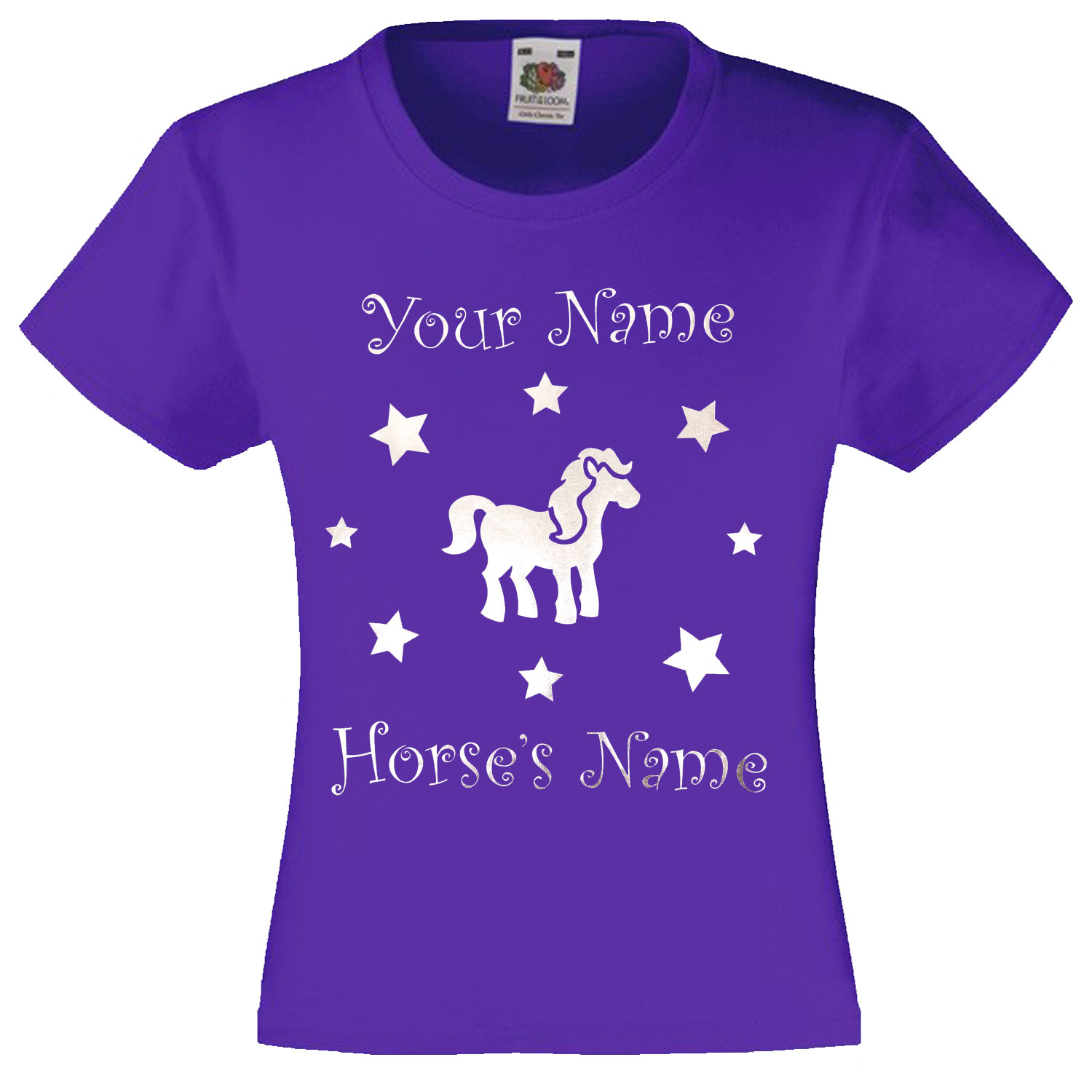 Little rockstars presents a girls personalised silver metallic pony T-Shirt, look cool at horse riding school with this shiny pony top personalised with your name and your horse's name of choice, please contact us at point of purchase with the personalised details.
